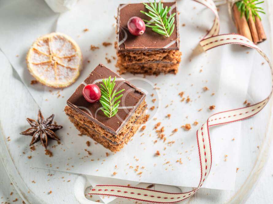 Soft sponge cake with dark chocolate topping and nuts